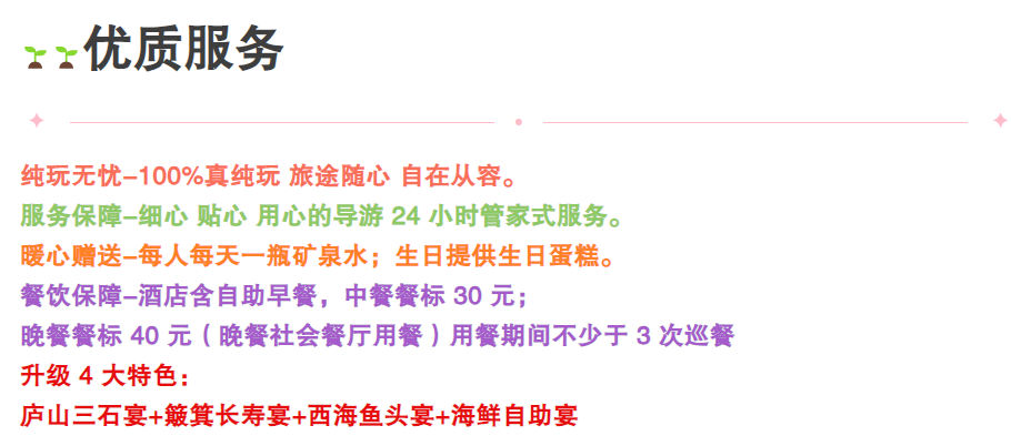 4.用餐:全程4早8正,餐标 30-40 元/人、10 人 1 桌,10 菜一汤;升级 4 大特色餐:长水簸箕长寿宴+西海全鱼宴+庐山三石宴+武宁海鲜自助宴;