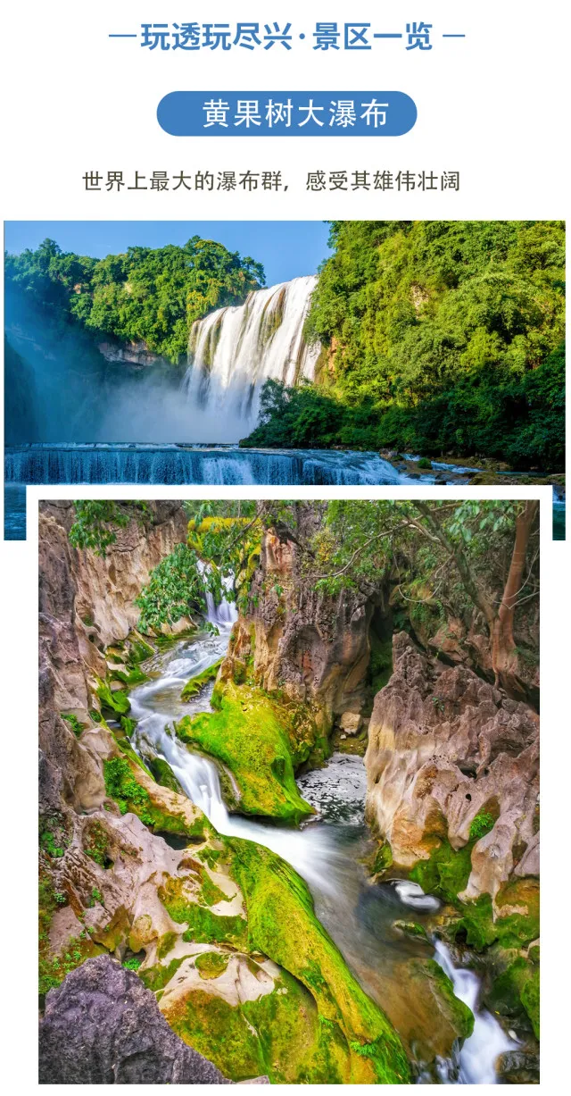 早餐后,乘车前往中国第一批“国家重点风景名胜区”,国家5A级风景区黄果树景区,亚洲第一大瀑布群;景区由【天星桥】、【黄果树瀑布】、【陡坡塘瀑布】三大景点组成。到景区后换乘景区环保车(不含环保车50元/人,保险10元/人请自理),游览有水上石林、天然盆景之称的【天星桥】;天星桥景区分为上、下两半段,这里顽石突兀而起,星罗棋布,步步是景。石中有水水中有石的【数生步】、婀娜多姿的【美女榕】、鬼斧神工的【瘦身石】;猪八戒背媳妇的【高老庄】、静谧的【天星湖】、冬暖夏凉的【天星洞】、犹如千万条银链的【银链坠谭瀑布】【飞瀑桥】等著名景观。