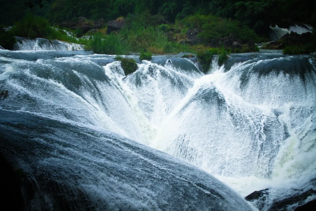 游览【陡坡塘瀑布】,是黄果树瀑布群中瀑顶最宽的瀑布,瀑布形成百米多长的钙化滩坝上,在平水期,水流清澈,瀑布显得十分清秀妩媚,水层沿着和缓瀑面均匀的散开,在粼粼的钙化滩面上轻盈的舞动,如一层薄薄的半透明的面纱,又如一面面张开的素绢扇面在阳光下泛着银光。1986年版【西游记】片尾曲里面取景地。
