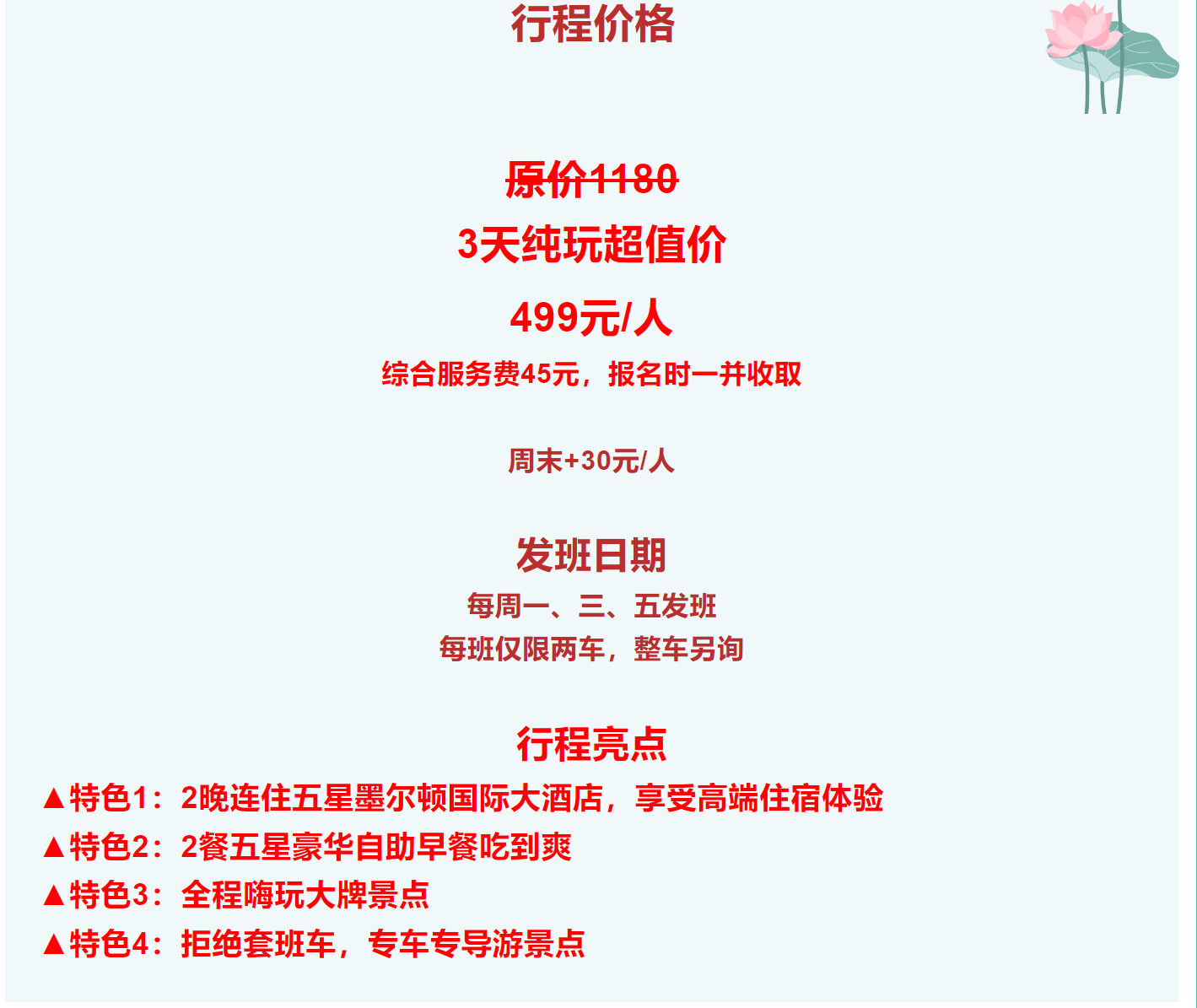 3、行程中景点门票均为团队打包补贴价、任何年龄、证件均无退费优惠,故行程内所有景点,特殊证件不再重复享受优惠,如有不参加者视为放弃、概不退款。