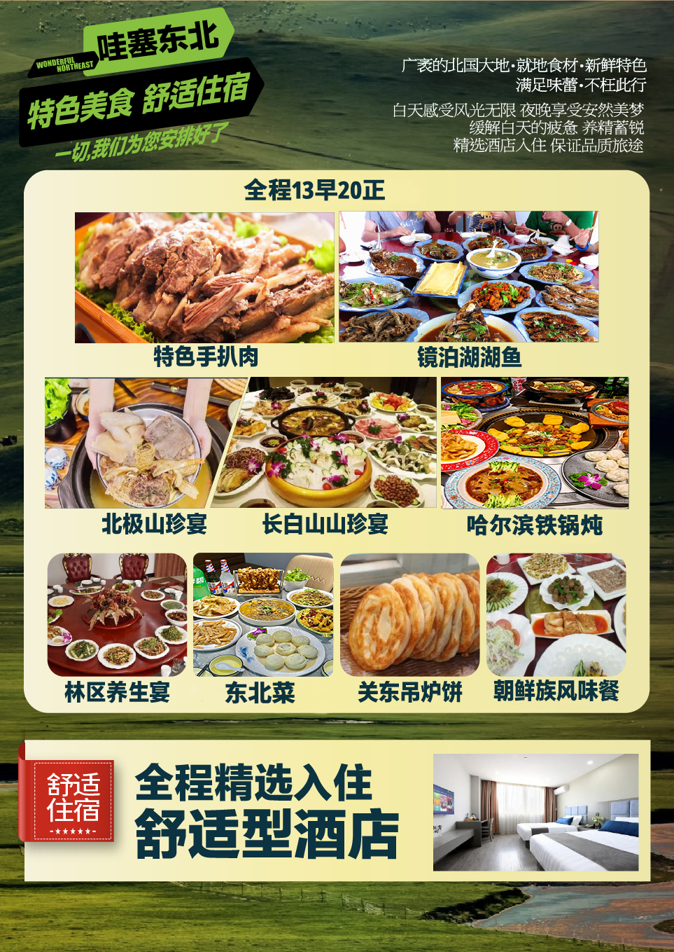 3、用餐:含13早20正,正餐25元/人/餐起,特色餐免费升级,团队餐提前预订,精心准备,不吃不退费用;东北+草原区间跨度大,用餐时间会提前或延迟,敬请谅解,特色餐根据行程进度适当调整。