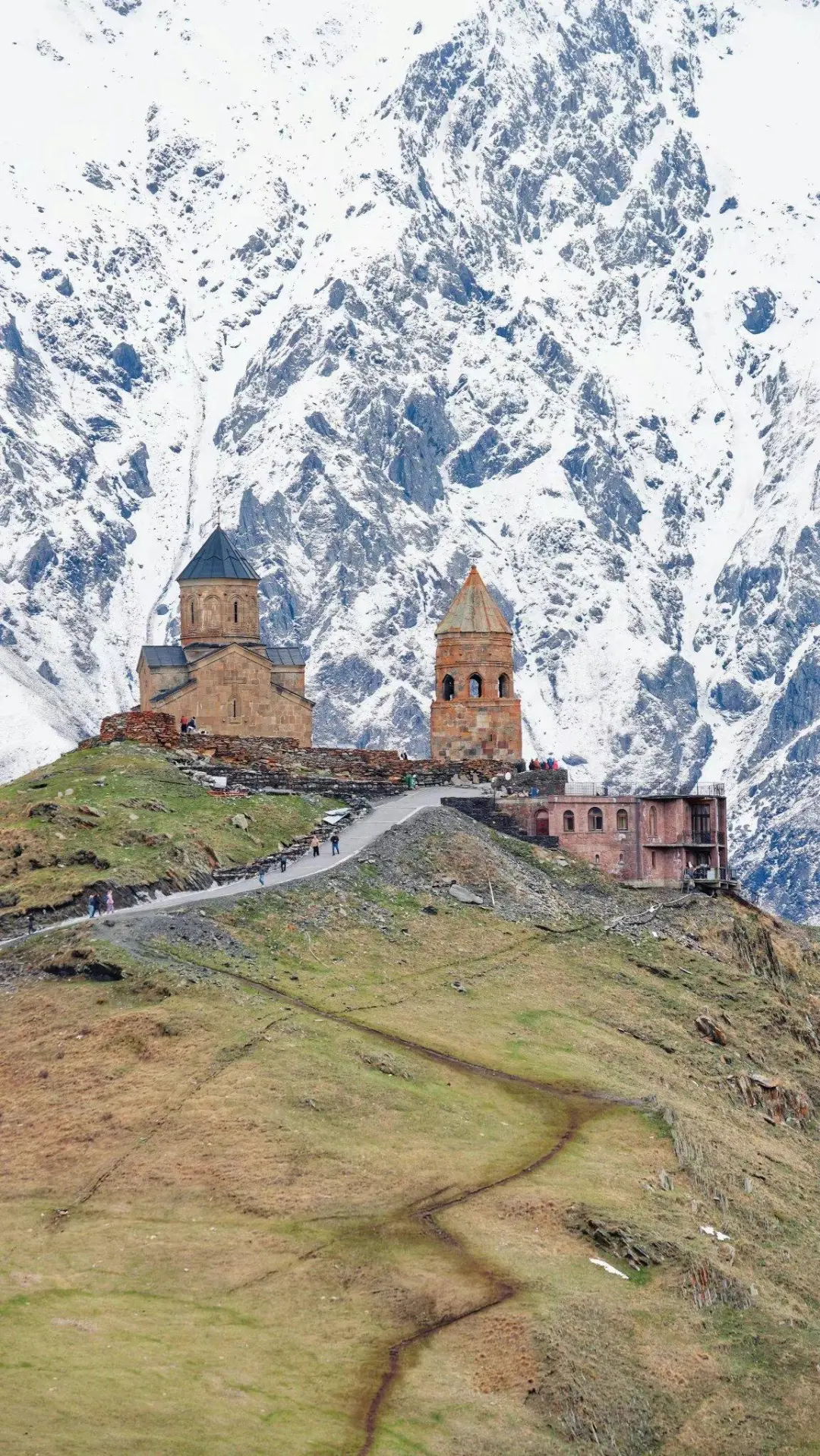 (途中游览位于陡峭山崖上的斯特潘茨明达圣三一教堂【Gergeti Trinity Church】(外观40分钟),这是世界上距离天空最近的教堂,耸立在悬崖之上,见证着格鲁吉亚的历史和风雨变迁,教堂海拔2170米,是格鲁吉亚的名片景观,上海世博会的格鲁吉亚展厅背景图就是这里。
