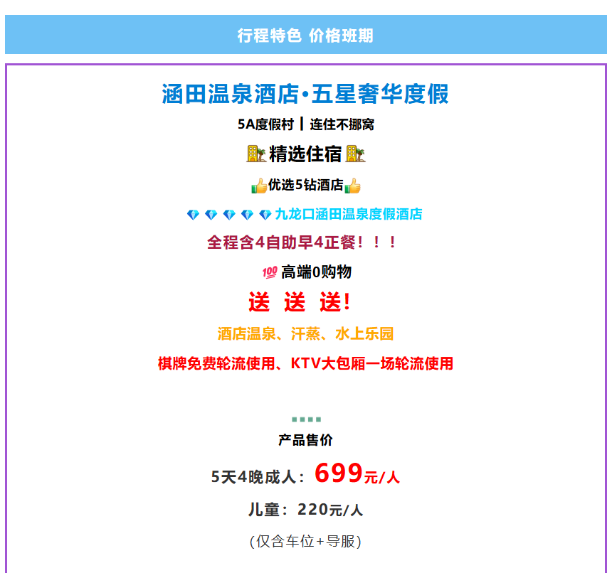 ★住宿:4晚九龙口涵田温泉度假酒店(单房差450元/人,务必带好身份证)