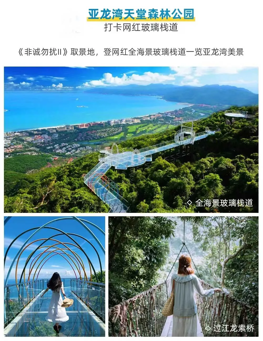 早餐后,参观游览以“美丽·浪漫·爱”为主题的【亚龙湾国际玫瑰谷/车程约50分钟,约90分钟,电瓶车自理】徜徉在玫瑰花海之中,奔赴一场浪漫的玫瑰之约;前往4A【亚龙湾热带天堂森林公园/约150分钟,车程约50分钟,区间电瓶车自理】园区定位于国际一流的滨海山地生态观光兼生态度假型森林公园,植被类型为热带常绿性雨林和热带半落叶季雨林。其生物、地理、天象、水文、人文资源丰富多彩,景观建设极尽生态自然,可开展登山探险、野外拓展、休闲观光、养生度假、科普教育、民俗文化体验等多种旅游活动。海南省是中国第一个生态省,而"热带天堂"就是离城市最近的天然森林氧吧。