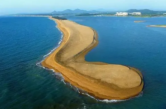 玉带滩一条细长的沙洲半岛,位于江海汇合处,两岸林木青翠,景色优美,银浪拍岸,烟波浩渺,一波万顷,气势磅礴。