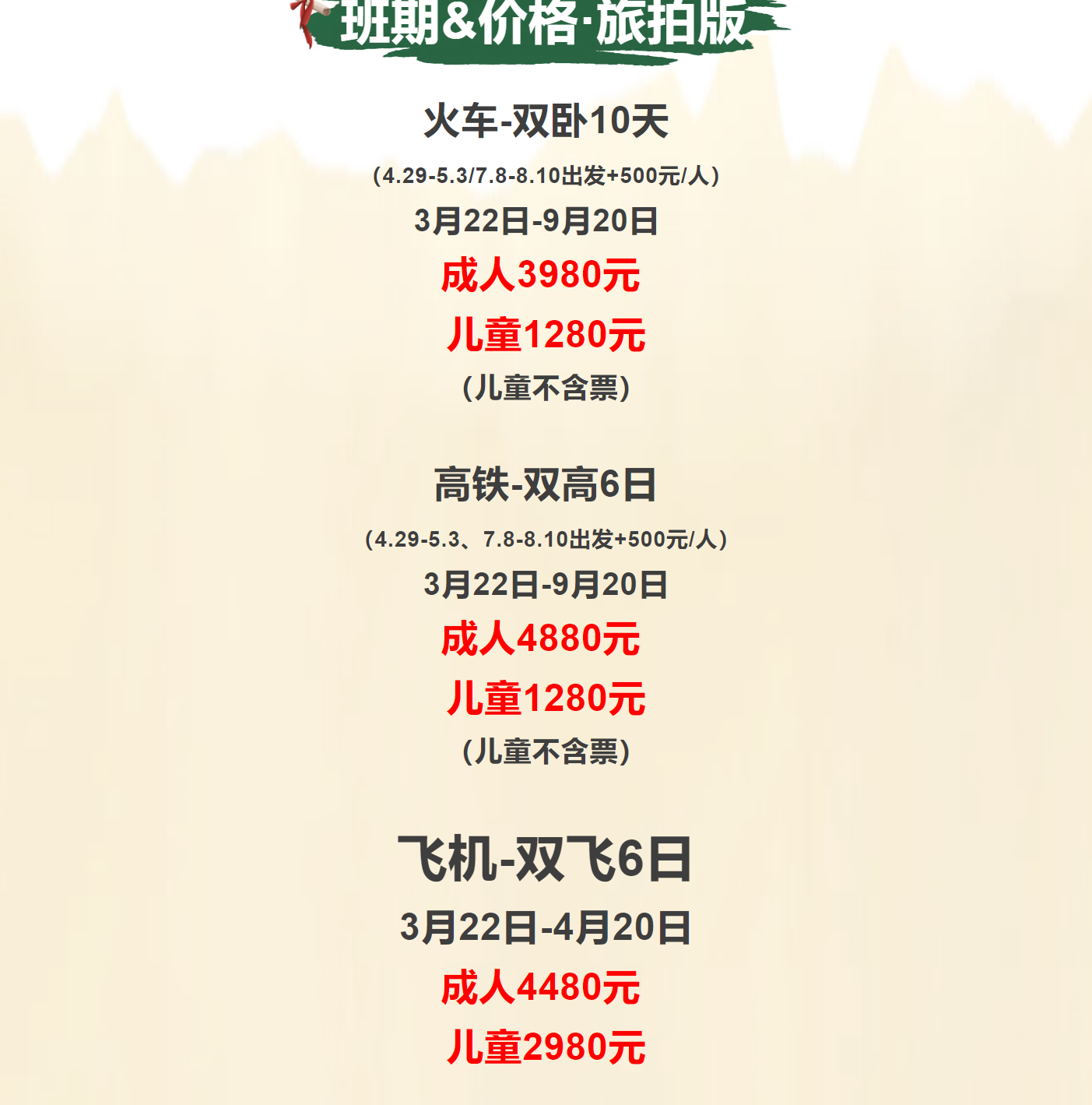 5、门票:行程所列景点第一大门票及赠送项目,赠送项目若因客观原因无法参观或客人放弃游览的费用不退不免!门票打包价,无任何优惠可减免!