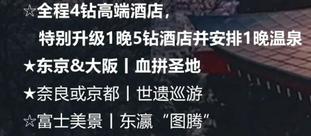 注1:行程中所含餐食,如遇特殊情况,可由旅行社另外安排调整前后次序,或根据客人要求同意等额退餐或变更其他风味料理。遇季节性的变化,将随着季节性变更餐食内容,本公司将保有变更餐食内容之权利。日本饮食与国内饮食习惯不同,以清淡生冷为主,请您做好心理准备。
