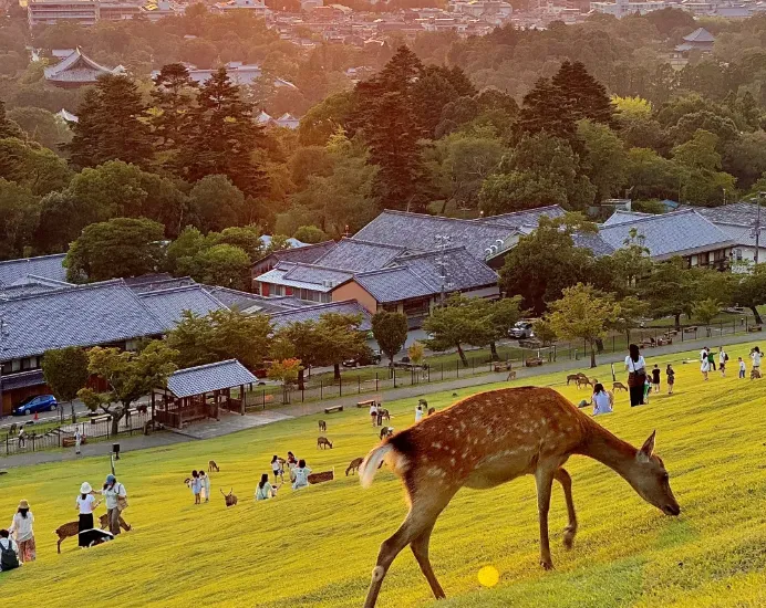下午前往【奈良公园】(约45分钟)奈良公园位于奈良市街的东边,公园面积广阔,若草山、东大寺、春日大社、国立博物馆等奈良的名胜古迹大多在这里。奈良公园最引人注目的是梅花鹿,其中有1200头鹿生活在这里,这些鹿大多温顺而讨人喜爱,会举行传统活动“割鹿角”。随后返回大阪。然后返回酒店。