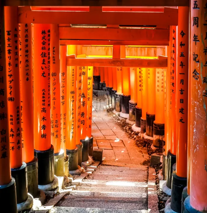 酒店早餐后前往京都【伏见稻荷大社】(约45分钟)伏见稻荷大社的入口,矗立着由丰臣秀吉于1589年捐赠的大鸟居,后面便是神社的主殿及其他建筑物。在神社里,还能见到各式各样的狐狸石像,这是因为狐狸被视为神明稻荷的使者。狐狸脸形的绘马是这里的一个特色。