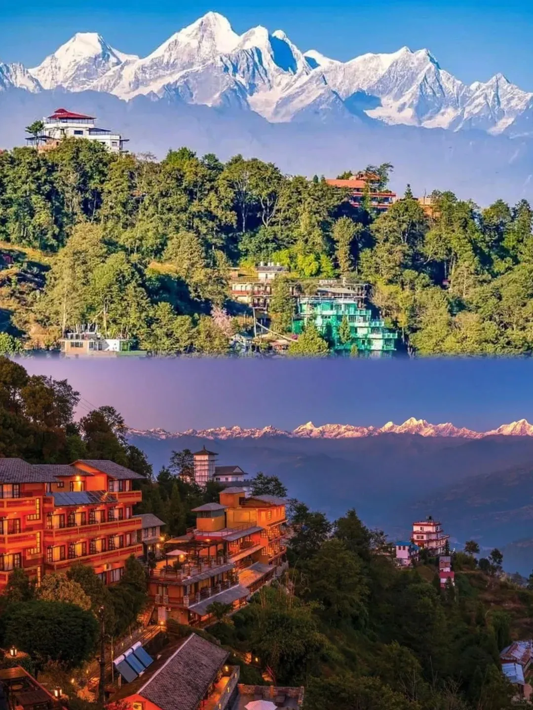 ❥纳加阔特是尼泊尔靠近喜马拉雅山的一处村庄,位于一座正对着喜马拉雅山的山脊上,被称为"喜马拉雅山的观景台",以最广最美的视角看世界第一高峰。加德满都山谷边缘地区以迷人的山区景色而著称。在所有风景名胜中,纳加阔特度假村的景色堪称第一。