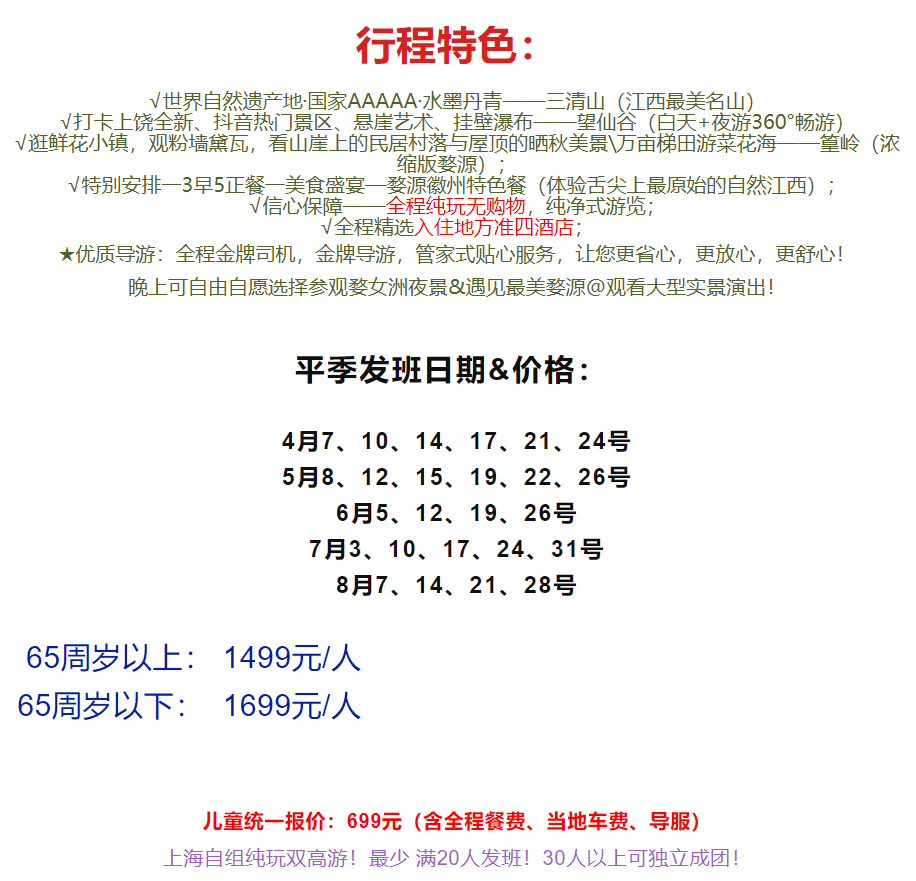 4、用餐:3早5正餐;(10人一桌,9菜一汤,人数不足菜量酌情增减! 如放弃正餐不用不退费,3月8-4月15号为婺源赏花旺季,用餐地点安排导游灵活调整,请理解配合)