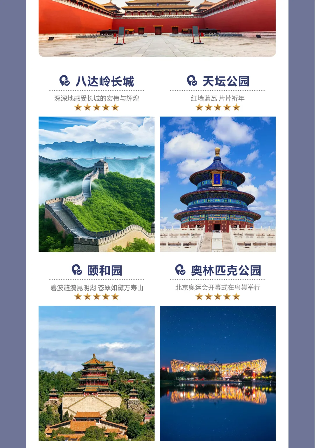 ☆温馨提示:当天行程景点位于北京古老中轴线上,全天以步行为主。加之此中心区域为国家重要职能部门所在地,交通管制严格明确,单行道内不可随意停车。故在此区域候车时间较长,步行路程较多,敬请提前做好心理准备,谢谢配合及理解。