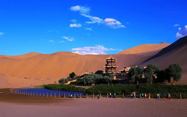 ▶后前往参观【鸣沙山月牙泉】(不含电瓶车,游览时间 2-3 小 时),古往今来这里以"山泉共处,沙水共生"的奇妙景观著称于世, 被誉为"敦煌八景"之一 。月牙泉处于鸣沙山环抱之中,其形酷似一 弯新月而得名,被誉为"塞外风光之一绝"。后入住酒店。