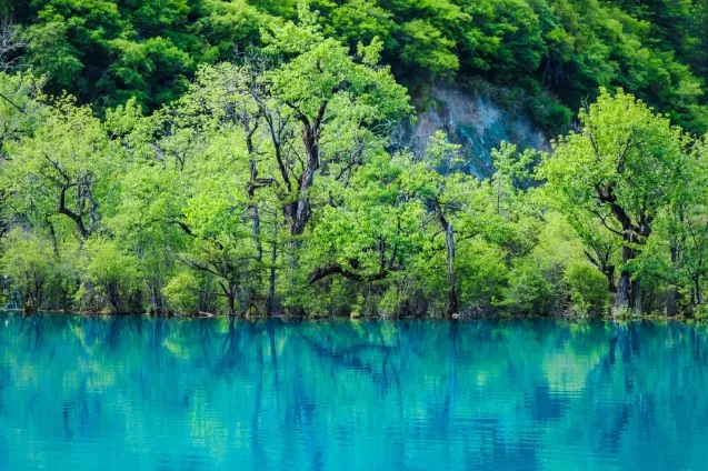 九寨沟的海子终年晶莹剔透、碧蓝澄澈,古树奇花的簇拥像是镶上了美丽的花边,飞动与静谧结合,清澈与多彩相融,水在林间流,树在水中生,花开水中央。