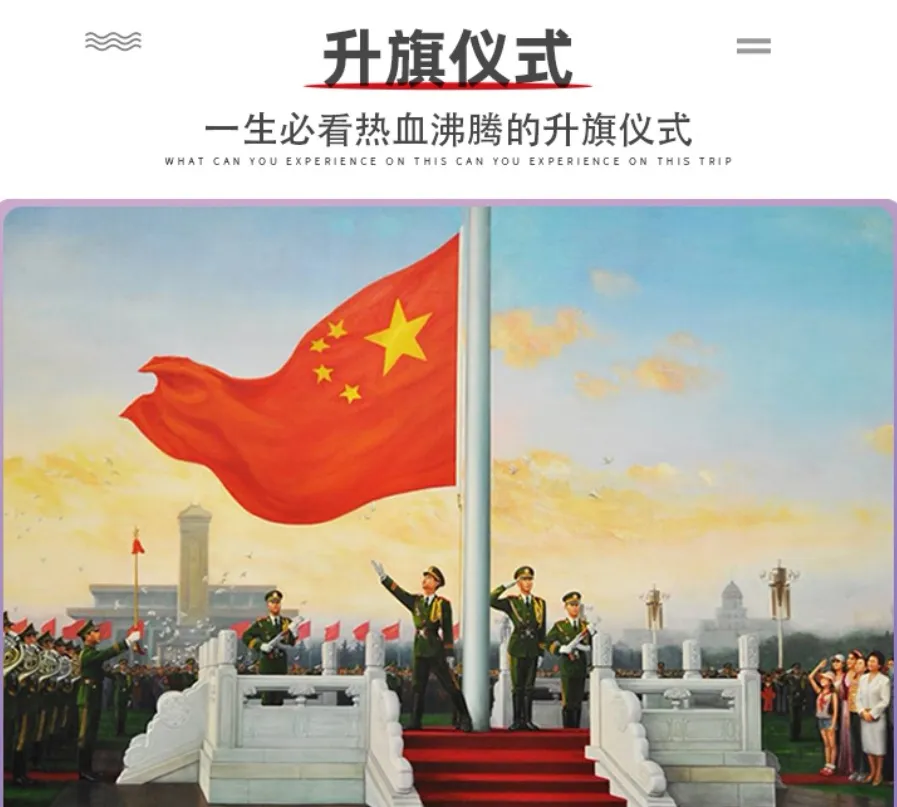 ● 早起观看【升旗仪式】(早餐打包、升旗需起早、出发时间导游具体通知为准、天安门广场目前每日实施实时调控限流政策,如因国家政策限流原因未能正常观看升旗则取消不另行安排,视为不可抗力免责取消)伴随着激昂的国歌,在天安门见证国旗和太阳一起冉冉升起的神圣时刻