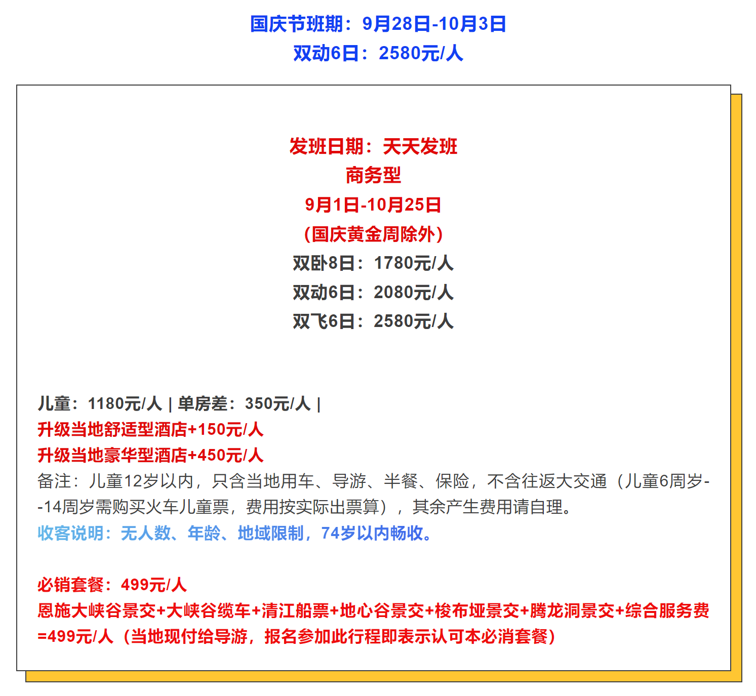 恩施大峡谷景交+大峡谷缆车+清江船票+地心谷景交+梭布垭景交+屏山渡船+综合服务费=499元/人(当地现付给导游,报名参加此行程即表示认可本必消套餐)