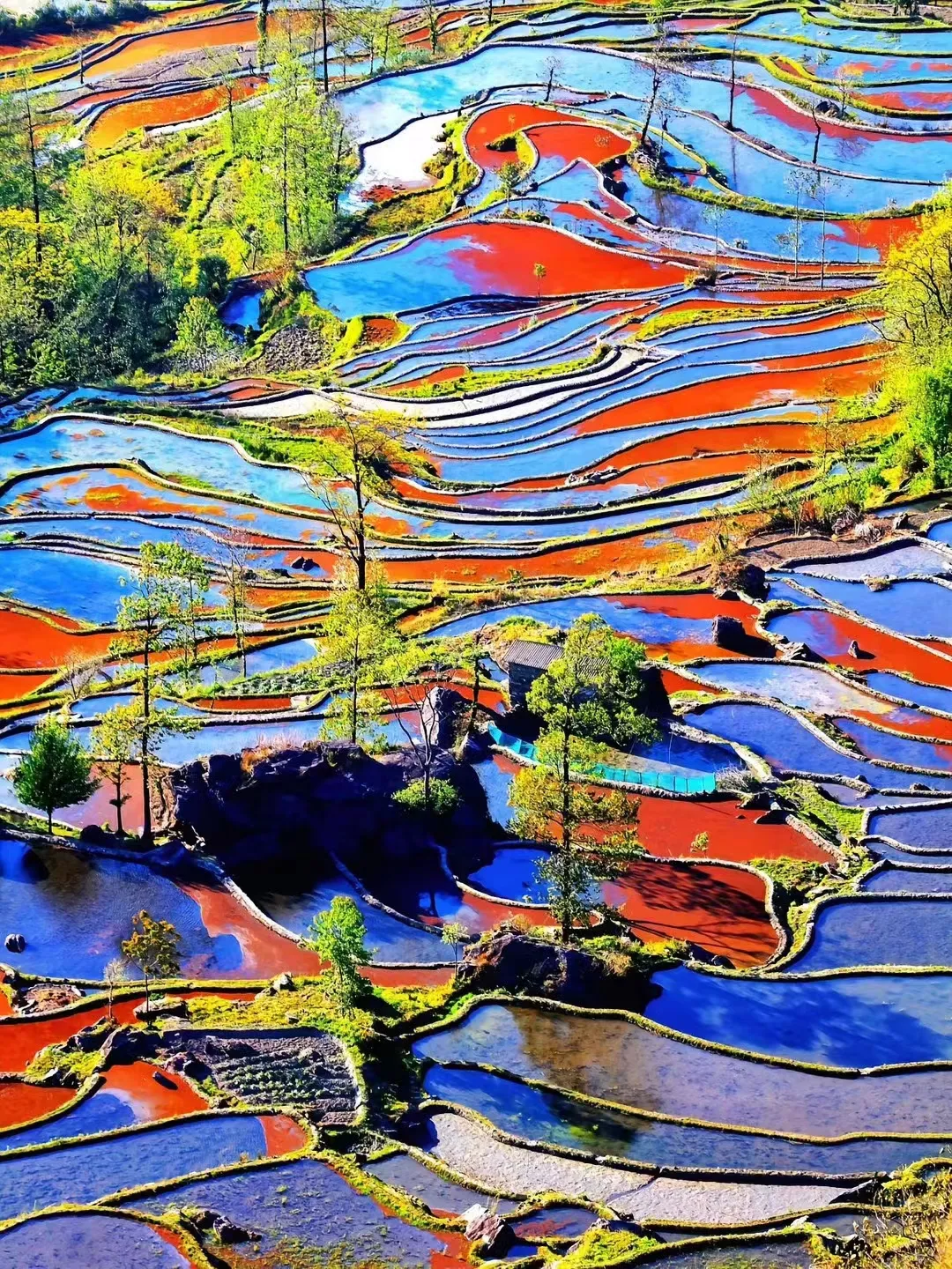 安排游览【爱春蓝梯田】(观赏时间约45分钟)梯田的水映衬了天的蓝色,天光云影共徘徊,水天一色,颇为好看。蓝天白云时最佳。(受天气影响,不保证一定蓝天白云)