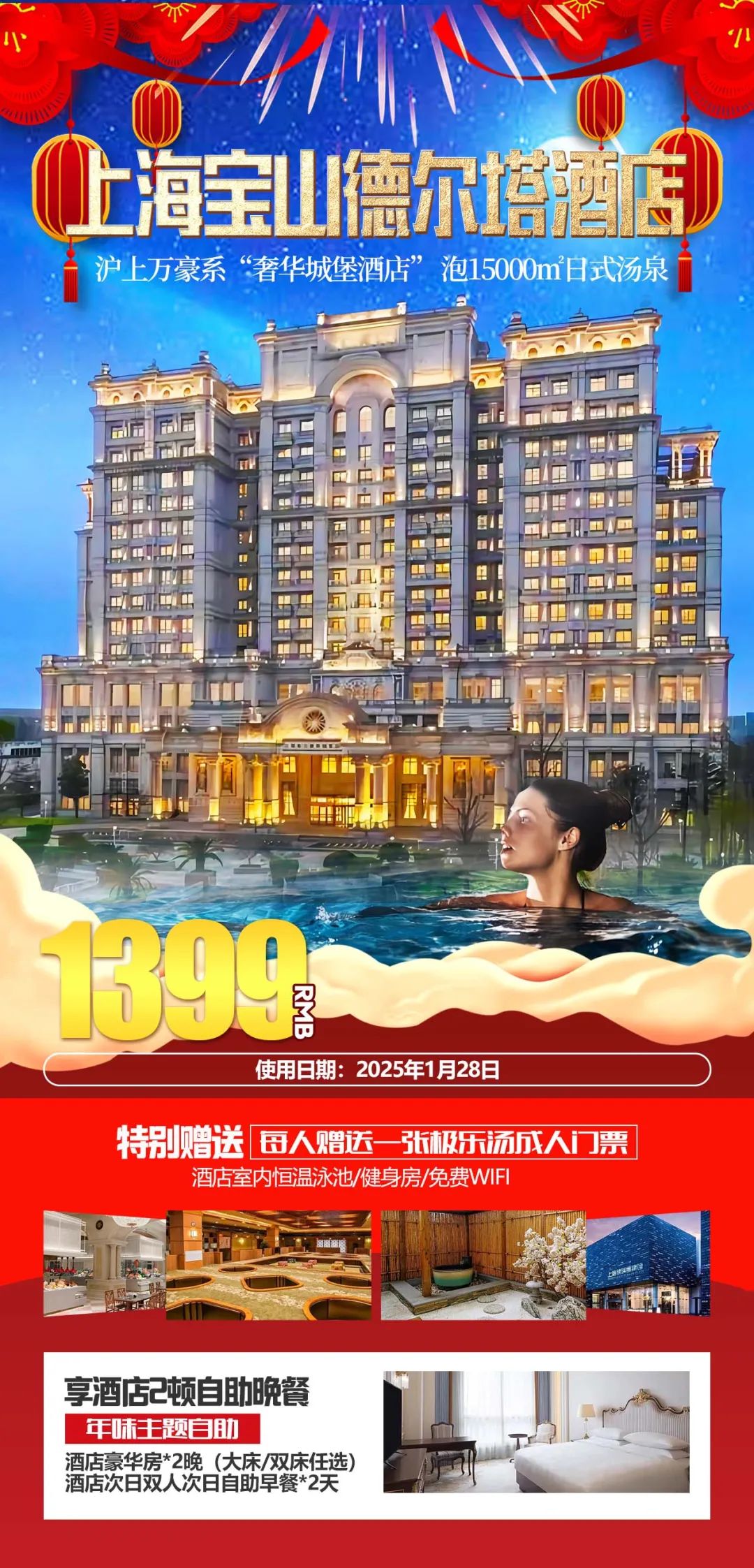 现特惠春节两晚+二餐酒店自助晚餐+一张极乐汤门票仅需1399元/人