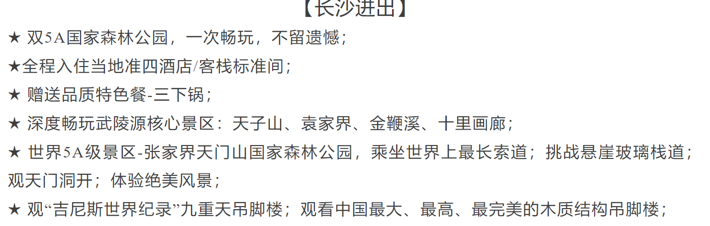 1、大交通:出发地-长沙,长沙-出发地。往返火车硬卧/往返高铁二等座。当地全程空调旅游大巴车,根据人数安排车型,保证每人一正座。