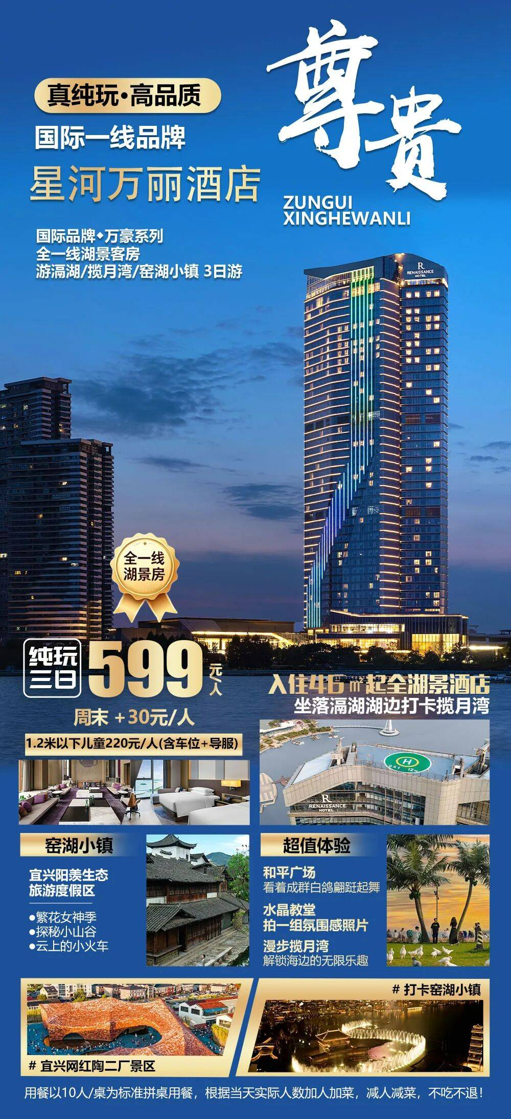 国际品牌◆万豪系列『2晚星河万丽酒店』全一线湖景客房46m²起◆入住高楼层18-25楼◆游滆湖/揽月湾/窑湖小镇◆含2早2正尊享三日游599元